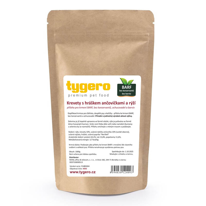 Tato exkluzivní směs pro BARF stravu spojuje hrášek, rýži, krevety (10%), ančovičky (10%), rajče a červenou papriku pro vášeho psa nebo kočku. Každá ingredience byla pečlivě vybrána pro své výživné vlastnosti a bohatou chuť, aby podporovala celkové zdraví a pohodu mazlíčka. Hrášek: Výtečný zdroj bílkovin a vlákniny, podporuje svalový růst a zažívání. Rýže: Lehce stravitelný zdroj energie a sacharidů, vhodný pro vyváženou stravu. Krevety (10%): Bohaté na proteiny a omega-3 mastné kyseliny pro zdravou srst a kůži. Ančovičky (10%): Poskytují omega-3 mastné kyseliny a minerály pro celkovou vitalitu. Rajče: Obsahuje antioxidanty a vitamíny pro zdraví srdce a imunitu. Červená paprika: Plná vitamínu C, který podporuje imunitní systém a dodává výraznou chuť. Tato mořská směs nejen potěší chuťové buňky vašeho mazlíčka, ale také nabízí výživu z mořských zdrojů. Každá porce byla s láskou vyvážená tak, aby splňovala potřeby syrové BARF stravy a dodávala důležité živiny pro zdraví. Zelenina je již tepelně upravena ve formě vloček, rýže je pufovnána ve formě lehce lisovaných burizon. Směs není třeba dále vařit nebo namáčet (burizony a zelenina by se rozmočili). Přílohu smíchejte s mletým masem a podávejte. Složení: Hrách, Rýže, Krevety 10%, Anchovičky 10%, rajčata, červená paprika Analytiké složení: Bílkoviny: 30%, Tuky: 3,3%, Vláknina : 3,6%, Popeloviny: 5,4%, Calcium: 0,73%, Fosfor: 0,69% Metabolizovatelná energie: 3 ,780 kcal/kg.